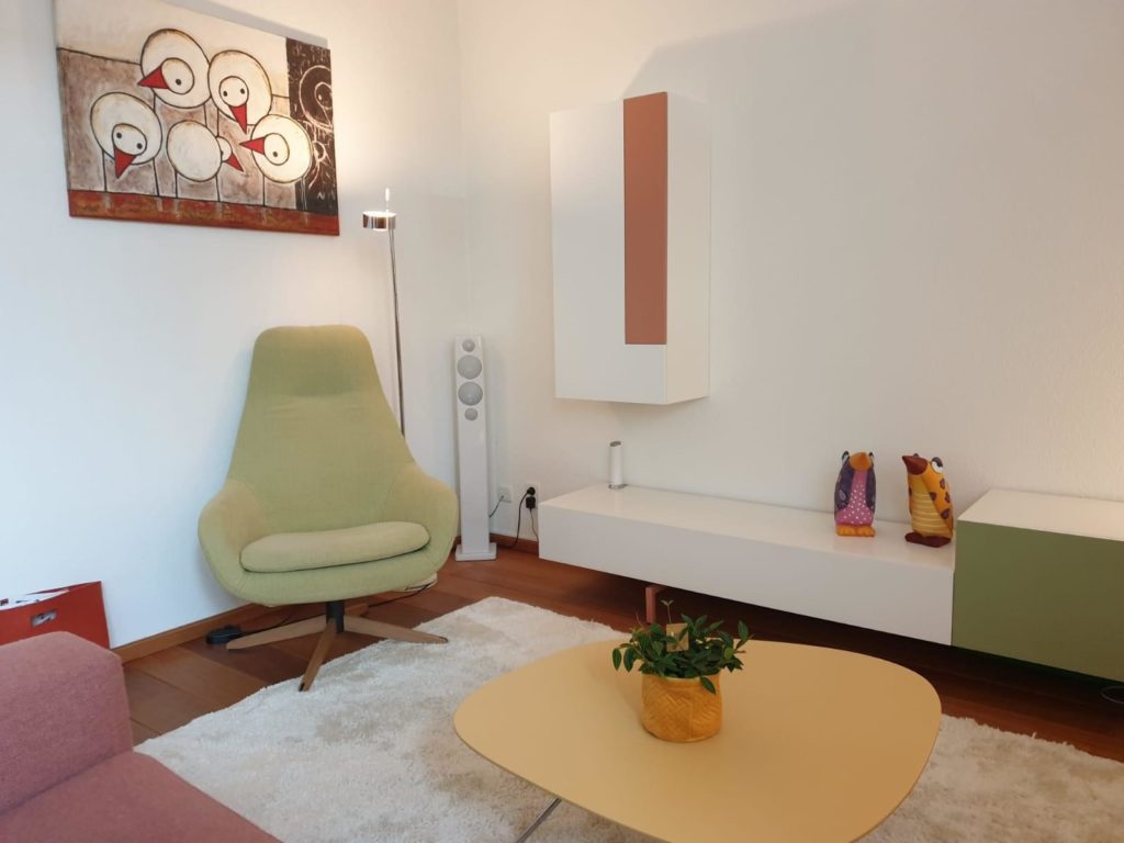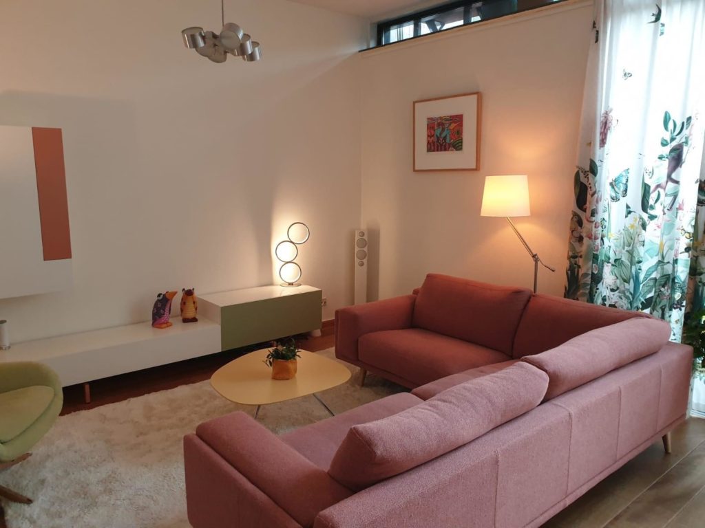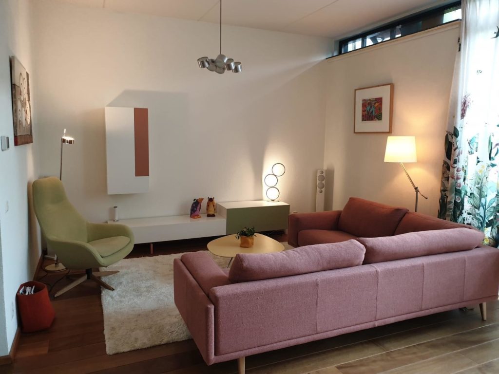 De zachte kleuren van dit geleverde project komen in combinatie met elkaar prachtig uit de verf. Met name de zachte kleuren groen van de kast én de fauteuil gecombineerd met de tinten roze in de bank geven het gewenste speelse én vrolijk effect.