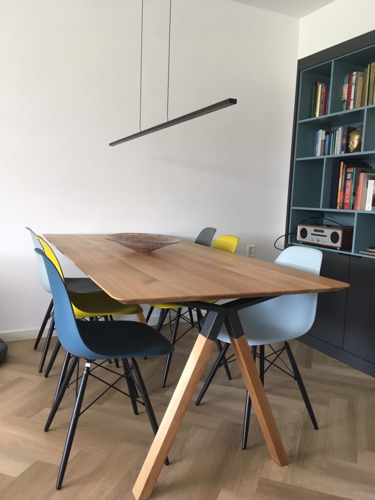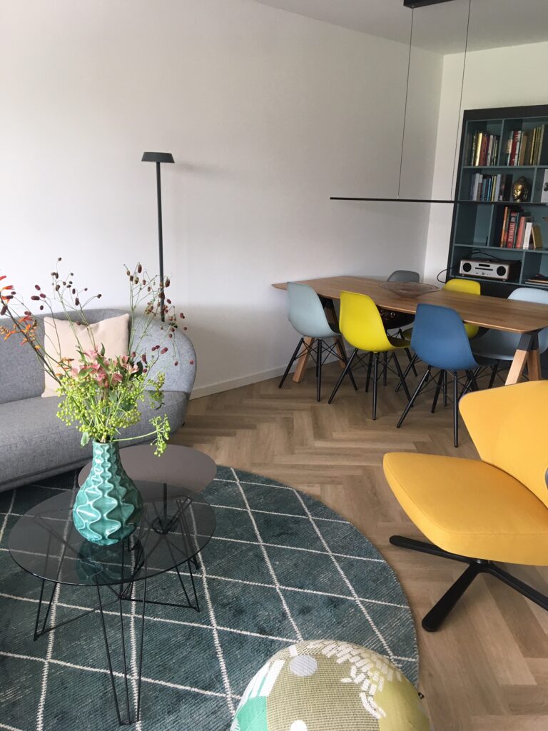 Door de combinatie van warme en koude kleuren is het interieur een geheel. Door de toevoeging van de blauwe aspecten, wordt het felle geel juist minder aanwezig. Een prachtig interieur!