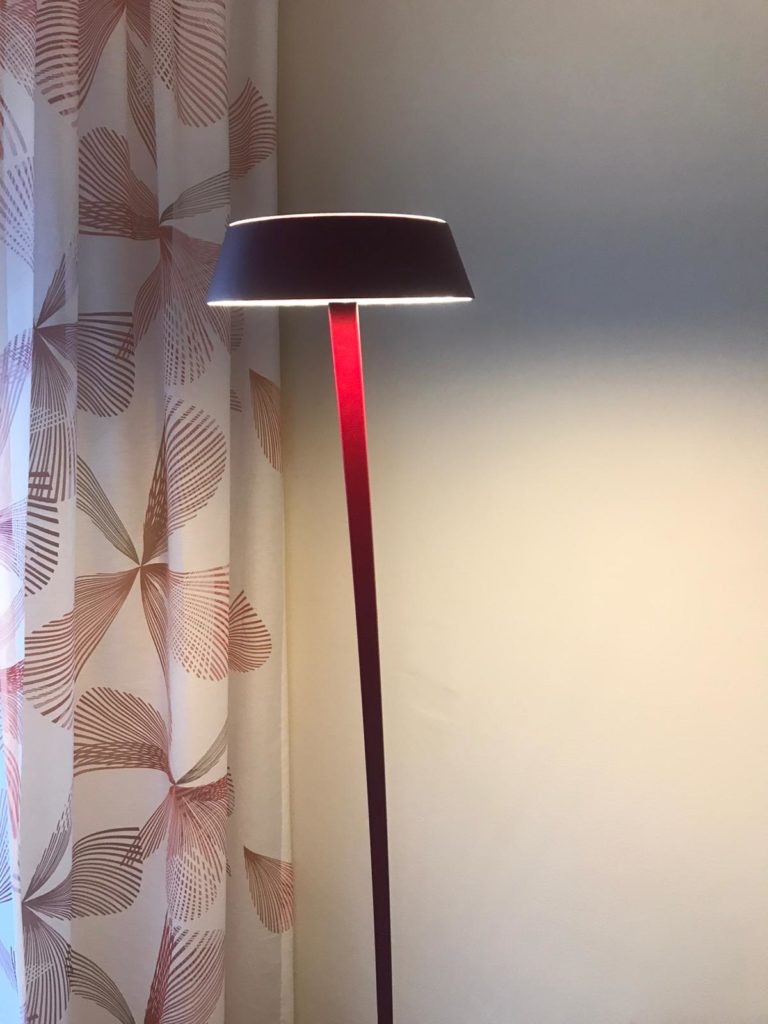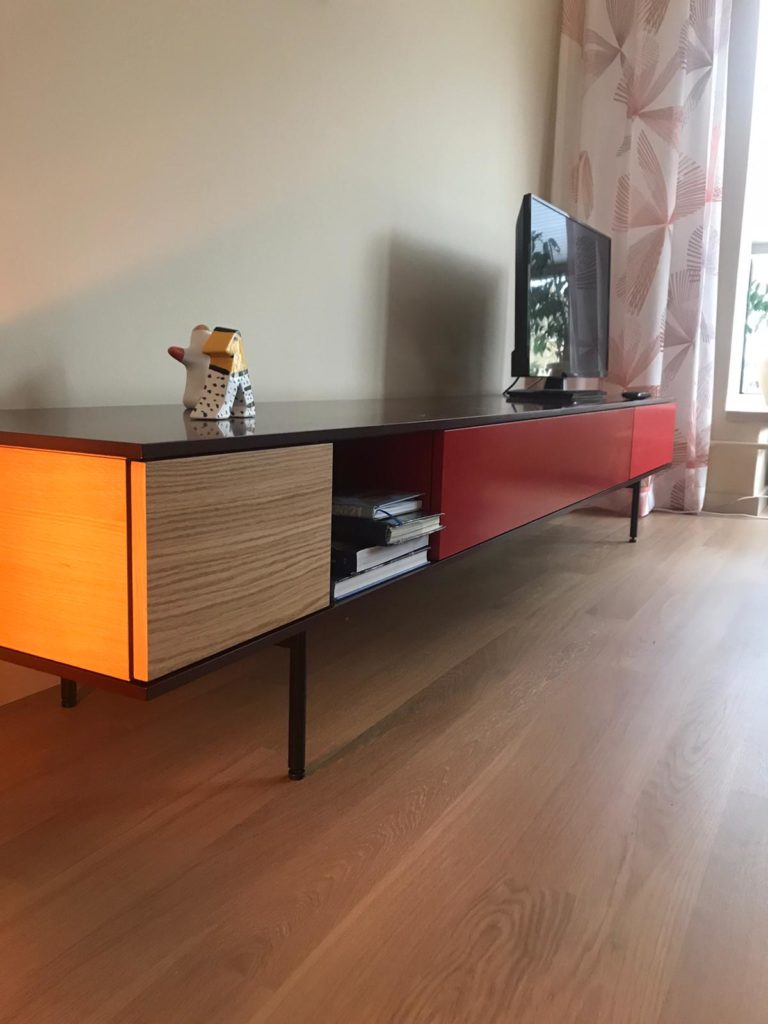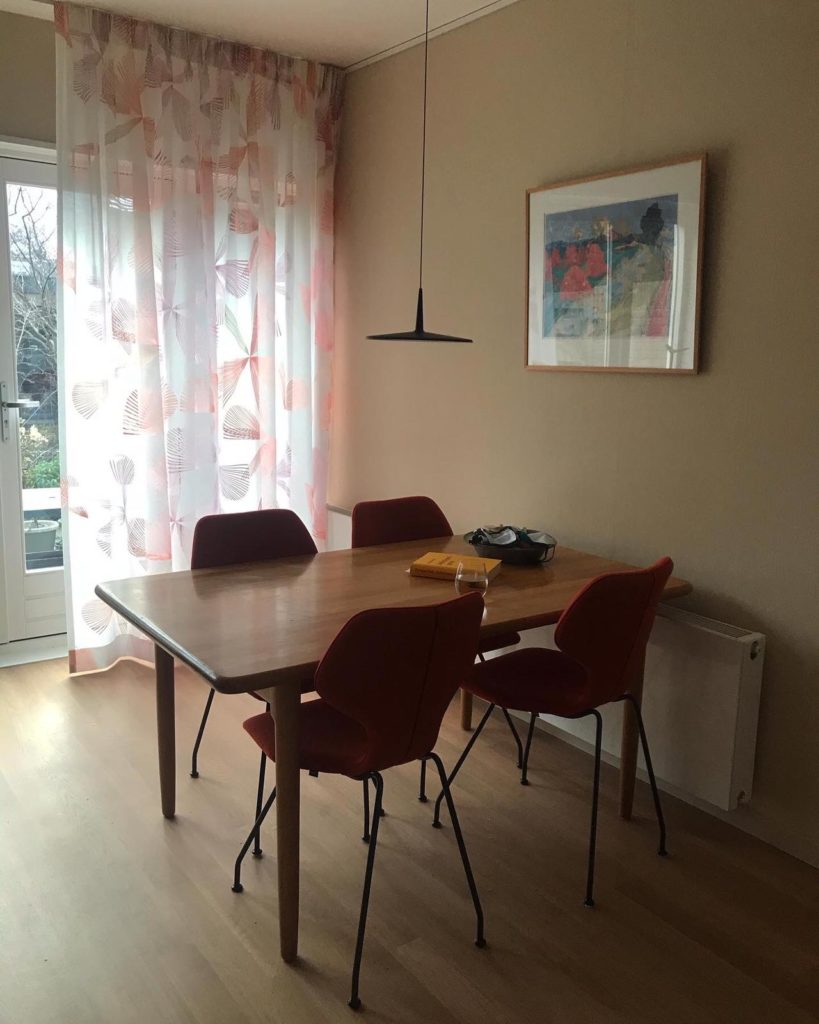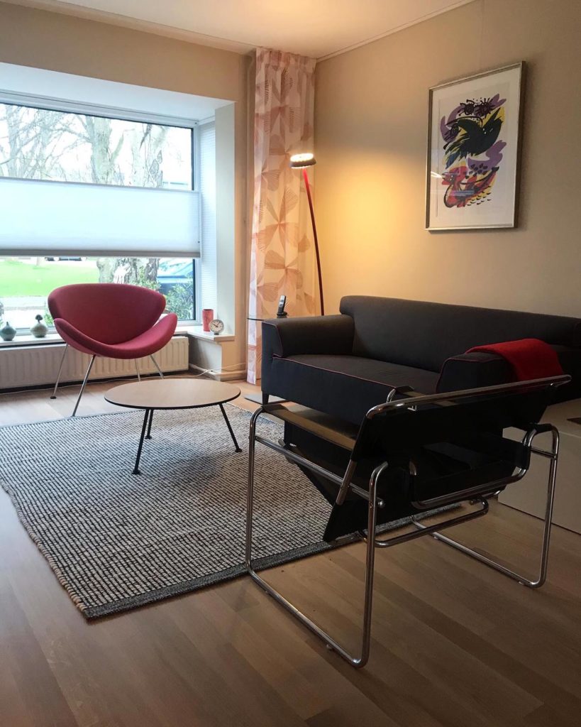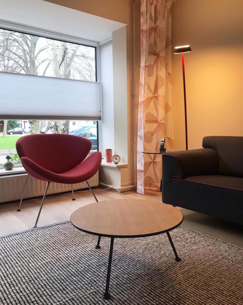 Deze woonkamer was aan een totale make-over toe! De muren hebben een nieuwe kleur gekregen, er is een nieuwe vloer gelegd én er zijn zowel nieuwe zonweringen als gordijnen opgehangen.  (Bijna) álle meubels zijn nieuw. Met rood als accent kleur. De meubels zijn allemaal hoog op de pootjes voor een grote mate van transparantie.